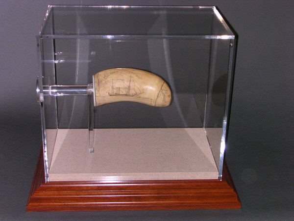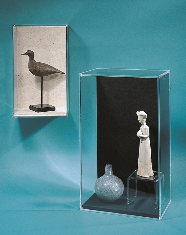 Acrylic cases are not used to hold up an artifact but are used in conjunction with the other mounting techniques to further protect an artifact. Cases are usually used with a base that has a top step that fits in the case. An artifact is put on a base with a case to keep it protected. UV filtering acrylic can be used to help protect the artifact from UV rays. Cases can be very small to very large, they can go on pedestals or over textiles. They can have square, rounded or beveled edges. They can have doors and they can go on walls. They can also be used with humidity control bases, to help stabilize the humidity in the case.